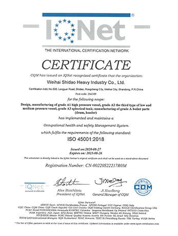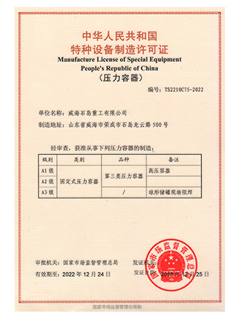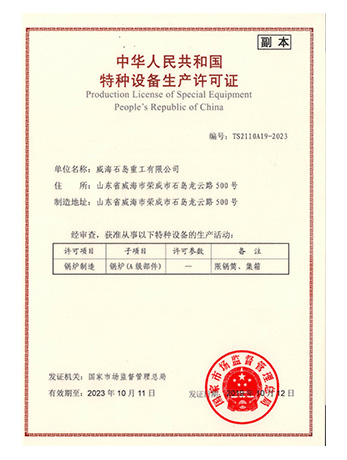 Weihai Shidao Heavy Industry Co., Ltd. inherits Mount Taishan Group's long experience in manufacturing boiler and pressure vessels, and has successively obtained the manufacturing and design licenses for A1, A2 and A3 pressure vessels officially issued by the state. With the outward development of the product, it has obtained ASME certification in the United States.